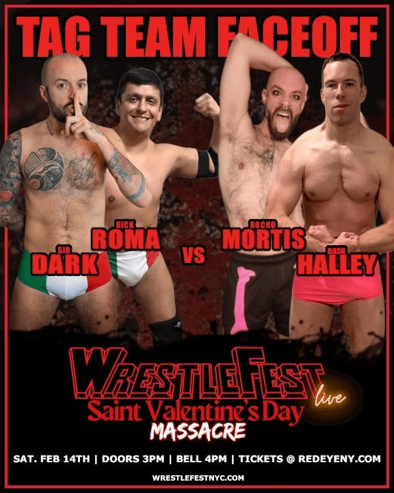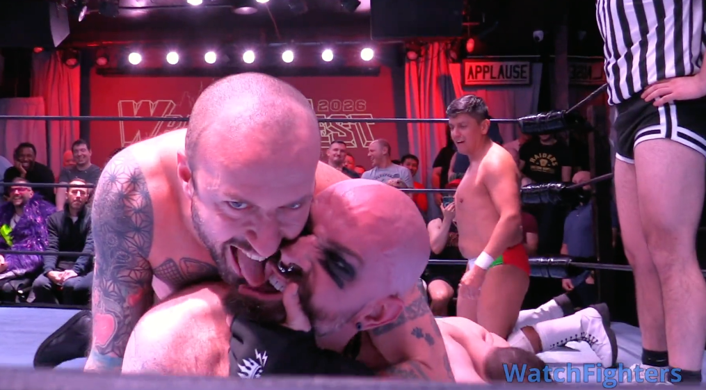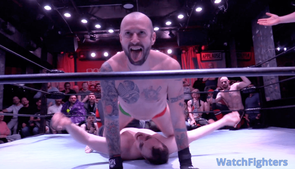 Watching this match (again), I’m in awe that this thing didn’t go off the rails a dozen different times. It’s super-fucking-sexy, with crotch-to-face poundings and luxurious body splashes that linger long and hard. But it’s also spinning like a centrifuge, with wrestlers and props and dignity flying out of the ring uncontrollably. I’ll never get tired of cuing up rival chaos demons daring one another to color farther and farther outside the lines. And I cannot get enough of babyface heroes crotch slamming their foes senseless and mugging for the roaring fans. And who do I have to sleep with to see someone suck Dash Halley’s nipples when he makes his third appearance on the card at Wrestlefest NYC ’27 (fingers crossed)?