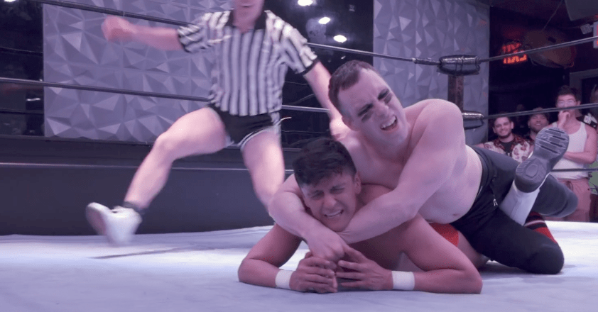 Rick and Dash tell a more calculated story when they’re in the ring. When the two of them are going at each other, there’s a furious back and forth of hot wrestling holds and near pins. Dash locks on a super sweet stepover toehold facelock that threatens to rip Rick’s head off his neck. In turn, Rick’s lariat on Dash nearly decapitates captain pecs, and the crowd keeps boiling over into an impassioned chant of “Roma! Roma! Roma!” Dash takes such a flurry of offense that at one point he slides out of the ring and looks like he’s about to walk off the scene entirely. Sir Dark taunts him from the corner and demands that Dash get his fine ass back in the ring so they can settle this. Dash delivers a super sexy, lip curling sneer as he climbs back onto the ring apron, jabbing a threatening finger toward Sir Dark and explaining, “Only because I’ll get a piece of you later!”