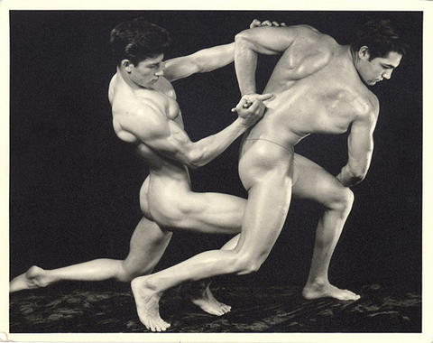 “Vintage” wrestling art holds a special place in my heart. The old photos and movies from the dark days of homoerotic suppression capture an amazing slice of history. American obscenity laws around the middle of the 20th century shaped the standards by which men’s bodies could be displayed for the sake of “art.” Videography and photography from early gay “porn” featured men in posing straps, frequently in highly contrived wrestling scenarios clearly intended to display beautiful young male physiques provocatively. Today, the images appear awfully tame, naive even. It’s homoeroticism cloaked in the (barest) pretense of modesty. The scenarios are so melodramatic as to be laughable, non-threatening, even juvenile. But what seems naive from today’s standards landed people in jail under the obscenity laws of the mid-twentieth century. The non-threatening scenarios and strategically covered up men were the flashpoint between a growing homoerotic sensibility and the desperate efforts of the establishment to defend heteronormativity. Although it’s apparently changed corporate hands at least once, AMG (Athletic Model Guild), is still selling the old catalogue and producing some new stuff with a nod to the vintage style. I hear that the 1998 movie Beefcake tells the story of AMG pioneer Bob Mizer (haven’t seen it yet). However far we’ve come in gay liberation and the maturing of the homoerotic and gay porn industry, the classics are still charming, beautiful, and sexy.