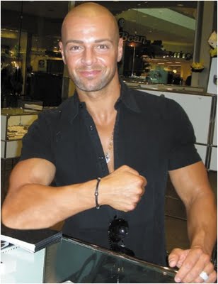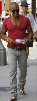And please, please, please, his personal trainer must tell him to lay off the supplements and the heavy upper body work, and do some squats. He’s totally out of proportion, and it looks a little freakish. I’m worried that his legs are going to suddenly snap like twigs underneath the weight of his oversized upper body. I’m not saying that someone needs perfect proportion to be hot, but seriously, to be so overdeveloped upstairs with skinny legs and no butt downstairs… isn’t that the classic caricature of the musclehead? As obsessed as I may become with one body part, symmetry and proportion can make the difference between totally hot and vaguely creepy.