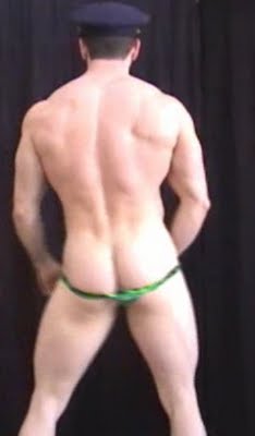 Completing my free association for the day, speaking of swinging pouches and rounded asses, this guy is just adorable, with his policeman-strip routine (be warned, full on nudity here on gaytube!). I have to say I’m a little anxious as I watch him, fearing he’s going to dislocate something (or put an eye out). But he’s nothing if not sincere and enthusiastic, and that (in addition to the wildly swinging cock and round white ass) is enough to put a smile on my face. Don’t know if he wrestles, but I’d pay money to watch it.