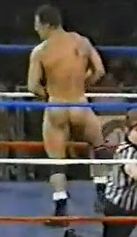 I’m free associating just a little today, but I also wanted to mention this match posted by matbaskin on YouTube. It’s a fun, short match that features the novelty of an intentionally bare ass in the pro-ring. The Chippen Devil gimmick is pretty cute, though the guy is clearly a little distracted by the choreography and mechanics of the routine. But once he rips off his tear-away sweat pants (did I mention that his name is Chippen Devil?), he actually looks much more comfortable. His low-swinging pouch really sells the novelty, but his thonged ass, as much as the camera lets us see, looks round and luscious.