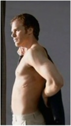But as Dexter, Michael C. Hall had me from the opening credits (why do I find it so sexy watching him floss?). And frankly, there’s something completely sick (in a kinky that’s-disturbingly-hot way), that Hall just married the woman who plays his sister on Dexter. Clearly, Michael beefed up after SFU to take this solo-lead in Dexter. Thank GOD this whole thing is set in Miami, requiring Dexter to be perpetually pitted out and sweat soaked where the center of his chest meets the collar of his shirt (I just felt a shudder!). Someone understands their audience, with not infrequent scenes of Michael C. Hall shirtless, though they’ve yet to fully unleash the wonder that is his astoundingly round ass. Hall must have it in his contract not to show too much skin below the waist (we get just the barest glimpse around episodes 6 & 7 of season 2). Someone needs to put some more money on the table so that we can all marvel at Michael’s finest feature!!!