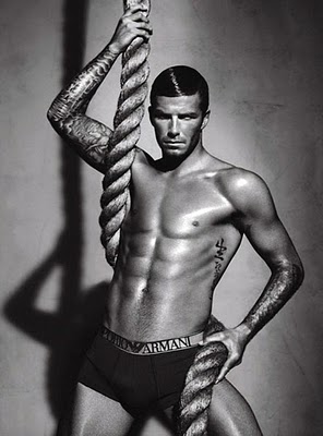 Designers of overpriced underwear continue, to this day, exploiting the blatant sexuality of the underwear ad to market a few square inches of thin fabric. God bless him, David Beckham can’t keep his clothes on, it seems, instead displaying his astounding physique over and over and over again for Armani briefs. The classic shot of David wrapped in a huge rope is a fantastically transparent marketing of man-sex. That coiled behemoth hanging between his legs promises that his six pack abs and footballer thighs aren’t the only thing that make David worthy of lust.