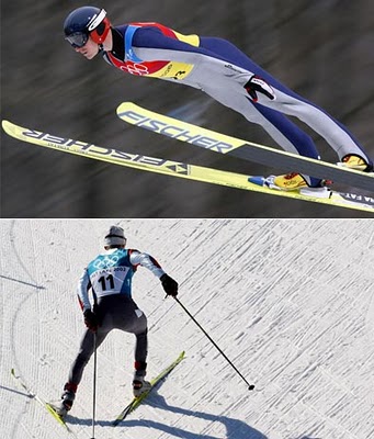 I shouldn’t need to confess my ignorance of winter sports again, but the Nordic combined? This is seriously outside of my frame of reference. Apparently these athletes combine cross country skiing and ski jumping. So I take it that this is about long suffering endurance with bursts of adrenalin-laced power. The cross-training format appears to build fatless, long, lean bodies squeezed into spandex. Nice.