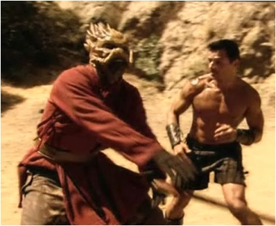 When I scrolled down to find that Antonio is in a shirtless wrestling match in this flick, holy hell… I sent up some prayers of gratitude for the gifts that Superherofan brings. The image of Antonio’s muscles bulging as he slaps on a sleeper hold are a homoerotic fantasy of mine come true. Of course, in my fantasy, Antonio’s opponent isn’t a tusked alien creature. Photoshop out the alien and insert me, and you’ll have a closer facsimile of my fantasy. Don’t forget in your photoshop work to include my raging erection, as I work to press my hips backward to work up some friction on Antonio’s manhood.