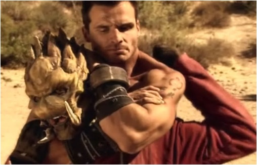 When I scrolled down to find that Antonio is in a shirtless wrestling match in this flick, holy hell… I sent up some prayers of gratitude for the gifts that Superherofan brings. The image of Antonio’s muscles bulging as he slaps on a sleeper hold are a homoerotic fantasy of mine come true. Of course, in my fantasy, Antonio’s opponent isn’t a tusked alien creature. Photoshop out the alien and insert me, and you’ll have a closer facsimile of my fantasy. Don’t forget in your photoshop work to include my raging erection, as I work to press my hips backward to work up some friction on Antonio’s manhood.