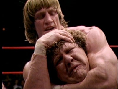 My fantasy is that Kevin pushes my back mercilessly against the turnbuckle, pushing his glistening stomach and chest against mine. Then I'm caught in a headlock as he pulls me to the center of the ring, where he bodyslams me to the mat. Then the headscissors … I'm caught in his muscular thighs, right at his crotch. I struggle, my legs and arms vainly thrashing against the canvas. Gradually my writhing helps me pull my head free … but it takes HOURS! Ultimately he has to finish me off with the Von Erich claw somehow, but the post-scissor details get lost in the vertiginous throbbing and cool shuddering that shake my whole rapturous body. (And, oh, by the way, his face was handsome enough.)