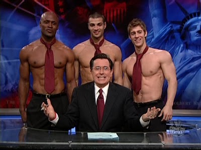 Gratuitous shirtlessness was the point of Colbert’s snide commentary on a disgraced religious right-ball who was discovered to have hired a male prostitute to rub him down naked during his European vacation. Colbert suggested that he hires his cameramen from the same “rentboy” website, and then the shot cut to Luke, aka “Julian,” running one of Colbert’s cameras in all his musclebound shirtless glory.