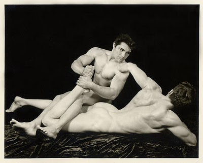 Classic AMG images of just this story never fail to please me. AMG always told the tale of boys being boys, engaging in naked/nearly naked combat with one another. Two young bucks puff up their chests, their eyes roaming up and down their opponents assessing the scope of the challenge in front of them. They strip out of their clothes to free themselves for the full range of motion that they may need to secure victory. Both brash, bold, gorgeous young hunks circle one another, both battlers sincerely convinced that they will overcome their challenger and prove themselves stronger, fiercer, more clever and more determined. Before the first touch of skin-on-skin, in the fraction of the second before they collide, grasping and twisting, in that instant before the battle is actually consummated, they are primal: youthful males announcing their entry into adult mating rituals.