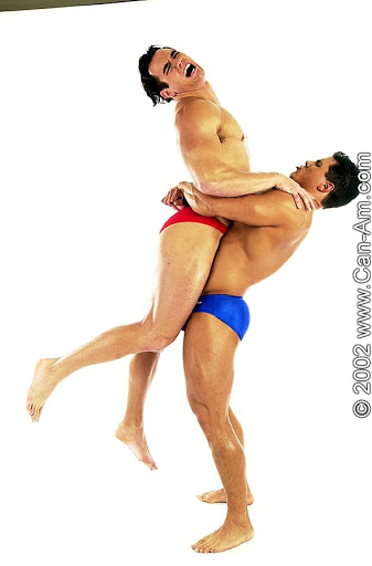 Ace comes across to me as straight up straight boy happy to bring in some extra cash by appealing to the wrestling fetishist among us gay boys. More power to him. As with most all the work at Thunder’s, there’s something oddly demure about the ferocity and stagecraft of Ace’s wrestling performances of late that leaves me craving a look at that moneymaker (in Ace’s case, this is most definitely that muscle ass of his). Happily, Ace’s prior incarnation in homoeroticism (as Eric Reins) feeds the need. In Can-Am’s Sex Submissions, Ace/Eric was working that fine, hard ass of his against the bodybuilder bruiser, Gauge. Unlike his more recent work, he wrestled bare naked (and with a ridiculous haircut… you’ll find that easy to ignore when you get a look at his glutes and cock).