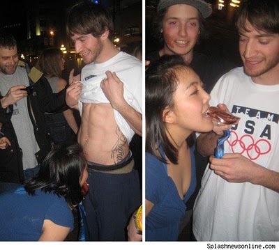 The best moment of moments, and I predict a precursor of things to come, was boarder hotty Scotty Lago getting caught on camera with his bronze medal wrapped around his tiny little waist, pulling up his shirt to reveal his sliced-to-shreds abs and hip tat, in order to allow an eager fan to lick the bronze medal dangling in front of his crotch. Scotty was rushed out of Vancouver in a flash. Apologies and recriminations were made. There was an official gasp of scandal. But I think Scotty is just ahead of his time. The Olympics are bound to get more overtly sexy in the future. The victorious competitor with a body built for worship is all about sex. Sure, there’s national pride. Sure, there’s the profound satisfaction of being the best you can be, and that being better than anyone else. But let’s face it, like all animals, we compete to determine which buck gets first pick in mating season. I say leave Scotty alone, and if he ever needs his bronze medal shined again, he can give me a call any day.