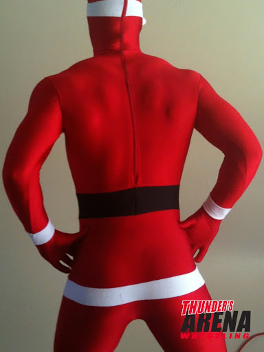 Joe has already posted an excellent low-down on the entertainingly bizarre Thunder’s Arena holiday release featuring a masked Secret Santa and his Evil Elf beating the crap out of one another. For an overview of what you get with this novelty match, including a most insightful implication of this as a Marxist morality tale, check out Ringside at Skull Island. On this 11th day of Christmas, I’d just like to point out a couple of additional things that caught me by surprise with this match.