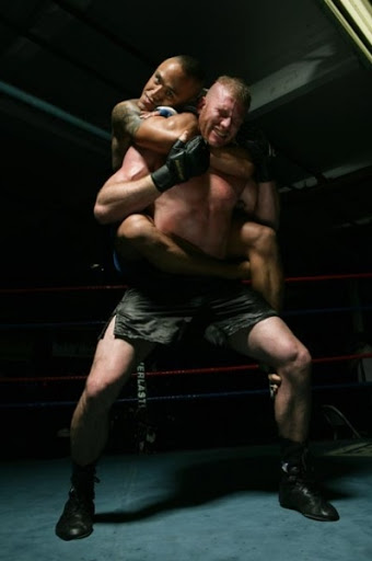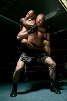 Full contact, I’m on the record, is not as arousing and engaging as wrestling for my tastes. It’s not that the moment a big, blond hunk’s eyes roll into the top of his head, as the tatted bad ass cracks his shin across the side of his face, doesn’t make my blood pump in all the right places. It’s just over so quickly. I need a little time to savor it, to milk the moment (so to speak), to be moved by the suspense of pressure and leverage and endurance and domination. When one hunk can turn the lights out on the other in a split second, I have to worry that it’ll all be over and done with way, way too soon.