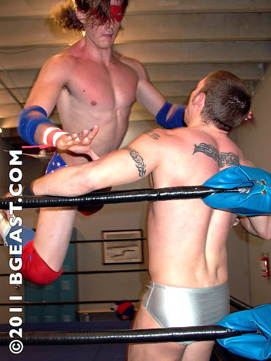 Someone else may not give a damn, but both of these boys catch air, and the brutal ballet that is 6’2″ Bobby soaring for miles on this way to splashing down brutally, crushing 5’5″ Jonny helplessly in the corner is incredibly satisfying. This is such a hot battle of fresh young heels that, truthfully, I nearly relented and named both Bobby and Jonny co-homoerotic wrestlers of the month (which would have pushed Bobby into the extremely elite category of being a 2-time title holder). But as entertainingly as both of these bad boys tell a story and sell their sadistic characters, Jonny has the razor’s edge for my affections here. It may be his head butt into Bobby’s abs as the big boy was still trying to recover, flat on his back, from a barrage of stomps. Perhaps it’s Jonny’s softball-size biceps, which are likely no bigger than Bobby’s but on his smaller frame simply look gargantuan. Maybe it’s my secret fetish for the little guy who overcomes the first-glance odds to power back and prevail over a much bigger opponent.