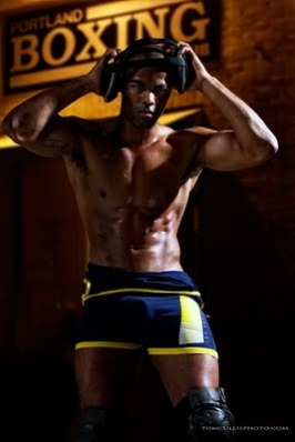 I’m coming up for air just a bit to root around in the fertile soil of my favorite blog haunts. File this under the heading “models in wrestling gear,” because the sign in the background may say boxing, but model Courtney Grant’s gear is all about wrestling.