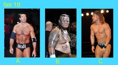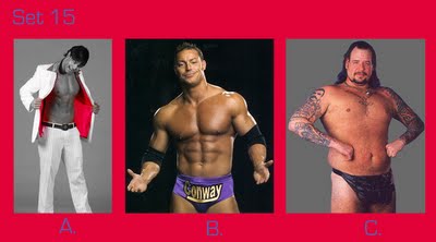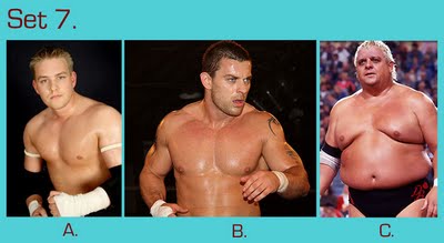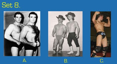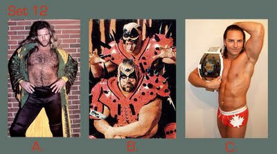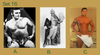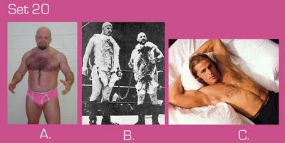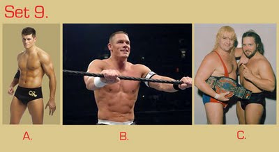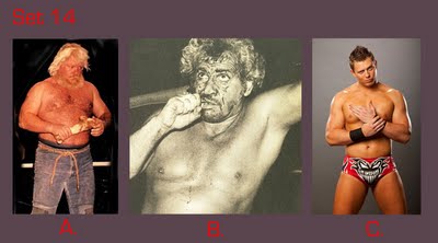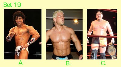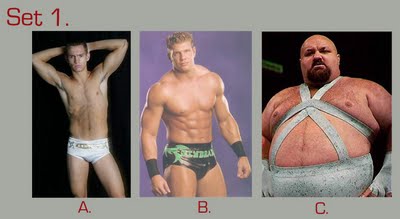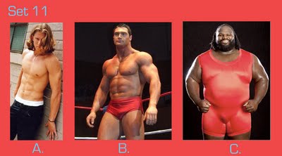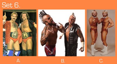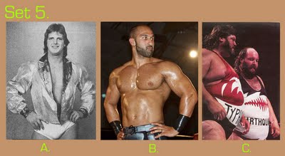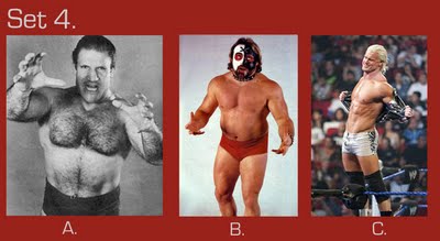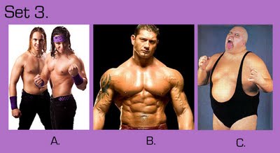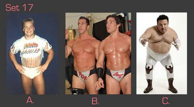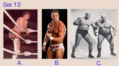 To take this quiz, number your answer sheet from 1 to 20. Below you will see 20 sets of pictures. For each set, select the wrestler or tag team that appeals to you the most and enter the letter under that photo (A, B, or C) onto your answer sheet. Don’t over-think your choice — go with your gut. Ask yourself: Which wrestler drew my immediate interest? If the wrestlers were in the ring, which one would I focus on or stare at the most? Or ask yourself, if the group suddenly appeared in your living room and offered you one match, who would you choose as your opponent? (Sorry fans of Two-on-One torture — only one selection per group is allowed!)