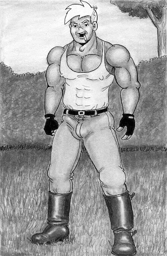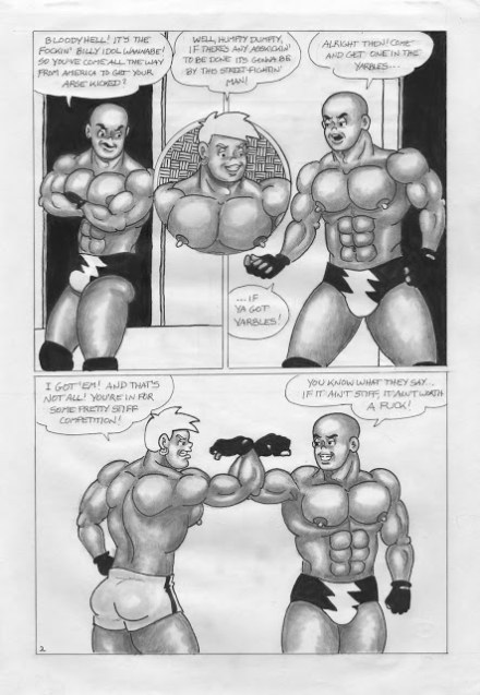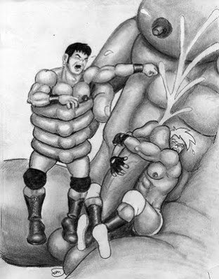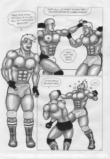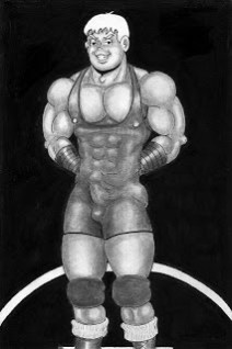 Bard: Clearly, there are a lot of us that find your work very satisfying, as well! It seems like you have quite an eye for the massively muscled boys with huge pecs, shoulders, nips and six packs. Is that the body-type that turns you on in live-action wrestling? Any hot lean twinks or big-bellied bear daddies likely to take a shot in pages of Rugged Action?