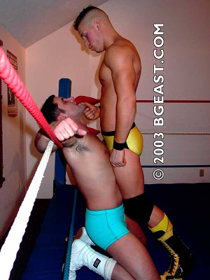 Aryx has wrestled an extremely impressive 26 matches so far for BG East. In addition to Brad Rochelle, Aryx has faced some BG East wrestlers that I count among the pantheon of timeless homoerotic wrestling greats. He’s been brutalized by Brooklyn Bodywrecker. Joe Mazetti nearly ripped Aryx sweet, tight pecs right off his rib cage. In a fantasy match made in heaven, he ran into the highly technically proficient buzzsaw of rockin’ gorgeous former tag team partner, Nick Archer.