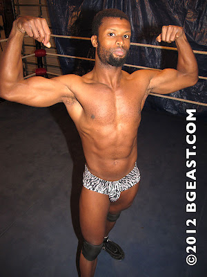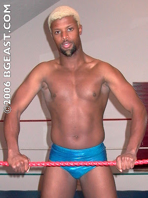 That tag match was a rare re-match after Charlie’s nasty mauling of hardcore pro boy Paul Hudson in singles competition. I’m not sure if lovely, lithe Paul ever looked sweeter getting worked over by the heavyweight Panther. The contrast between them is a work of art. Charlie’s gorgeous, dark brown complexion wrapped around Paul’s blindingly lily white skin only skims the surface of the visual contrast between these two “blonds.” Paul is whittled down to the lean loveliness of a professional athlete who trains relentlessly and probably has the genetic gift of burning calories effortlessly. The snarling Panther is a full half a foot taller, fifty or so pounds heavier, and bursting at the seams to bully his lightweight indy pro opponent.