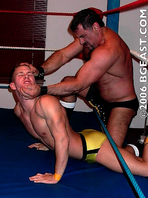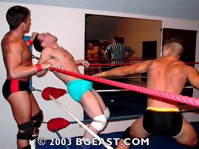 Blogs like neverland, Ringside at Skull Island, Beefcakes of Wrestling, Wrestling Arsenal, and Inner Jobber have been successful (I believe) in raising the profile of professional homoerotic wrestling in recent years. Hell, 164 people voted in yesterday’s poll, and even if we guess that as many as half of Aryx’ votes might have been from non-wrestling kinksters, that still suggests that 140 or so guys not only tuned in, but had an opinion about which homoerotic wrestler deserved their nod. And behind the scenes, there were about 1,250 people who hit up neverland yesterday, accounting for about 3,000 page views. I’m sure several of the other blogs that focus on the homoeroticism of wrestling for gay eyes see that much traffic or more. In other words, there’s an audience not just buying some DVDs and getting off in the privacy of their homes on homoerotic wrestling; there are also thousands tuning in for more, probably getting a taste of what they might like to sample next, or too financially strapped (or closeted) to purchase some homoerotic wrestling to own and so sampling from the photos and text we blog about, or maybe even stumbling into our corner of the net with that first, tentative, anxious search engine revving around the words, “GAY WRESTLING.”