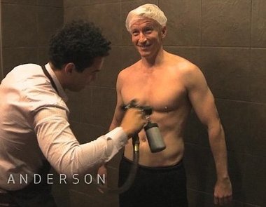 In his first and, to date, only appearance in the Producer’s Ring, Anderson fought a grudge match against that touped Fox News pretty boy Bill Hemmer. Like most of my homoerotic wrestling fiction, this match works out some of my personal issues, as evidenced by 1) the context is lube wrestling, and 2) the gay silver fox owns the Fox News lovely in body and soul, hoisting Hemmer across his shoulder and heading to the locker room to stuff something down Hemmer’s throat to shut him up for good.