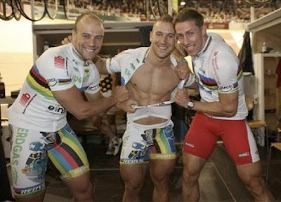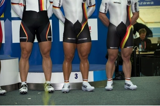 I’m the first to admit that I don’t follow competitive cycling. I have no idea if thighs that would make a juiced pro bodybuilder weep with envy necessarily translate into gold medal track cycling. But I do know one thing: a homoerotic wrestling competition starring these monster quads would pack the stands with the likes of you and me!