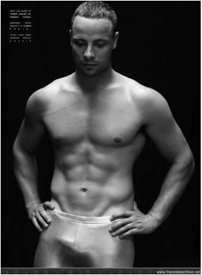 Gasps from the stands greet Andreas’ choice for a tag team partner for the finals. South African hottie Oscar Pistorius has been a hot topic on the circuit for a couple of seasons. The sprinter who is a double amputee had to lobby hard to even attempt to qualify for the homoerotic wrestling competition. Potential opponents complained that his prosthetic blades were fundamentally “foreign objects” that could be used as a weapon in the ring. The handsome South African persevered, and with charm that has become in and of itself legendary, talked himself into the pool of potential wrestlers to go for gold. He didn’t qualify for the individual round robin, but strolling out in green skin tight square cuts, he clearly caught the eye of Andreas to get the nod to join him for tag team glory.