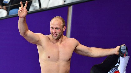 Finally, big Robert Harting ducks through the ropes and points directly at Oscar. “You!” he barks. Andreas leans his head back and whispers furiously with his partner. The debate lasts about 15 seconds, but finally the South African sprinter hops off the top rope and steps in front of his partner. It’s Andreas’ turn to shout encouragement and massage his partner’s shoulders as Oscar shifts from blade to blade, flexing his arms and psyching himself up. Finally Andreas slaps him on the ass hard and ducks out of the ropes as Oscar begins to circle the ring, stepping gingerly over the fallen contenders. Robert doesn’t bother stepping over them, slamming his feet into stomaches, heads, crotches… whatever. When he thoughtlessly grinds his heel into Usain’s crotch, the Jamaican gold medalist’s eyes snap open in shock and agony. He bellows a cry of pain and grabs Robert’s ankle. It takes Robert no more than about 3 seconds to glance down in surprise and figure out who’s grabbed him and why. In just those three seconds, Oscar flings himself into the ropes, uses them to catapult across the ring and leap through the air, clotheslining the German giant across the throat. Already off balance and completely flat footed, Robert tumbles backward like a felled tree.