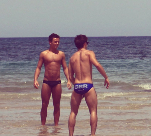 Once again, the loudest welcome is for team Great Britain, as semi-finalist sex bomb Tom Daley trots across the pool deck side by side with Britain’s other teen dream, smoking hot 19 year old pretty boy Christopher Mears. Both handsome hotties wear matching white speedos with blue and red trim. They’re the youngest team in Olympic homoerotic wrestling history, and what they lack in ring experience they more than make up for in hometown advantage. The stands are shaking with the stomps and shouts of excitement when Tom and Chris climb onto the ring apron. They pump their fists in the air, acknowledging the roaring crowd.