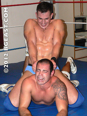 For the range, the endurance, the buckets of sweat, that sweet ass, that dimpled chin, those luscious pecs, and the supreme and well-founded confidence in his mastery of the art of mat wrestling and his mastery of narcissist muscle stud Aryx, and especially for that double bicep, growling and preening, Denny Cartier joins the elite of the elite as a two-time homoerotic wrestler of the month!