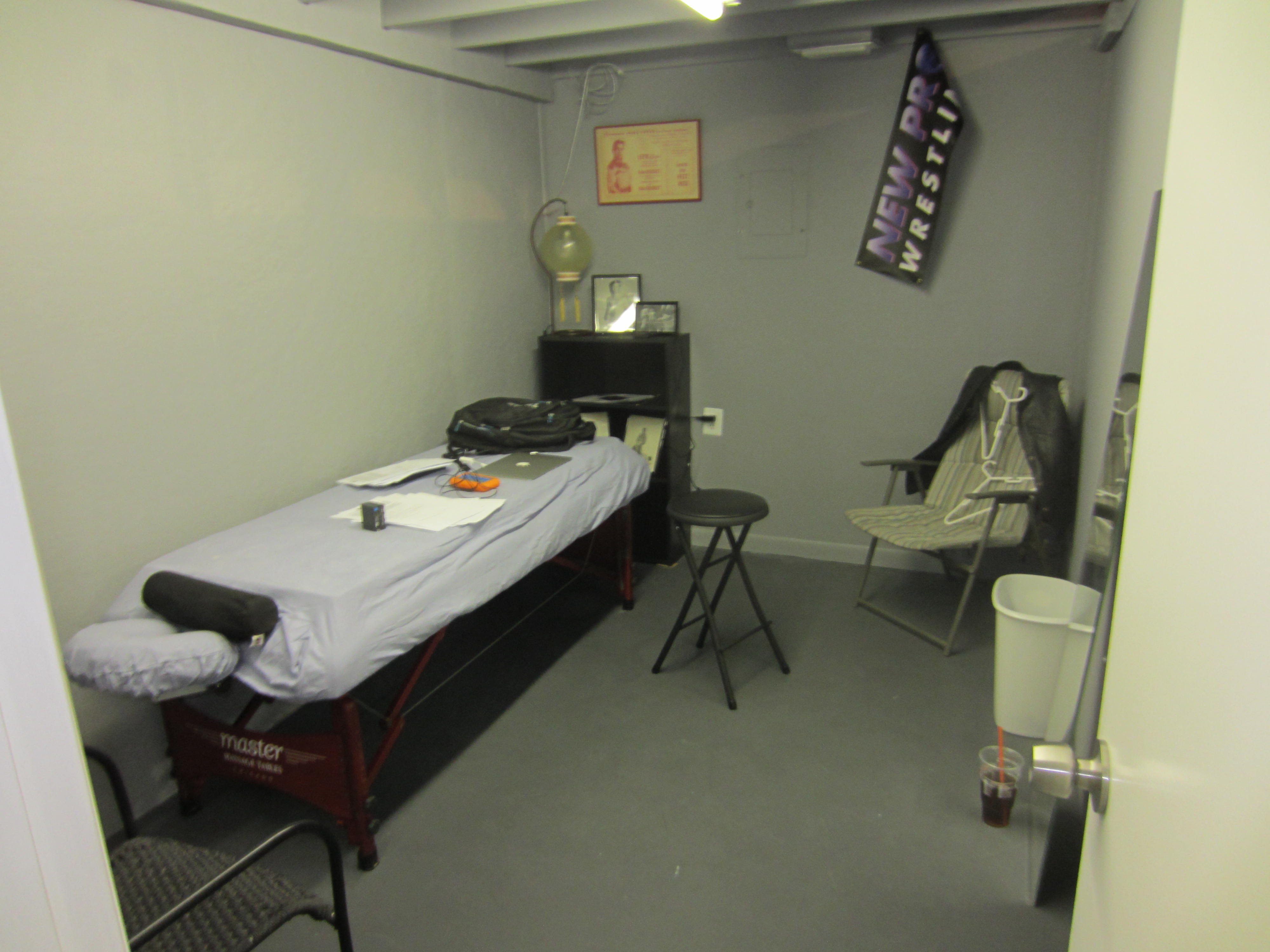 There were just a few shots that I didn’t have to post from The Boss’ indulgence of my lust for behind-the-scenes insights. They are of the “lounge” area, the break room for homoerotic wrestling hunks. Taking a break between matches? Grabbing a quick bite or rehydrating before climbing back in the ring and pounding the hell out of an opponent? Stop off here and kick back, text your boyfriend, shoot the shit with the gorgeous, barely clad hottie in pro trunks and mid-calf boots across the room from you.
