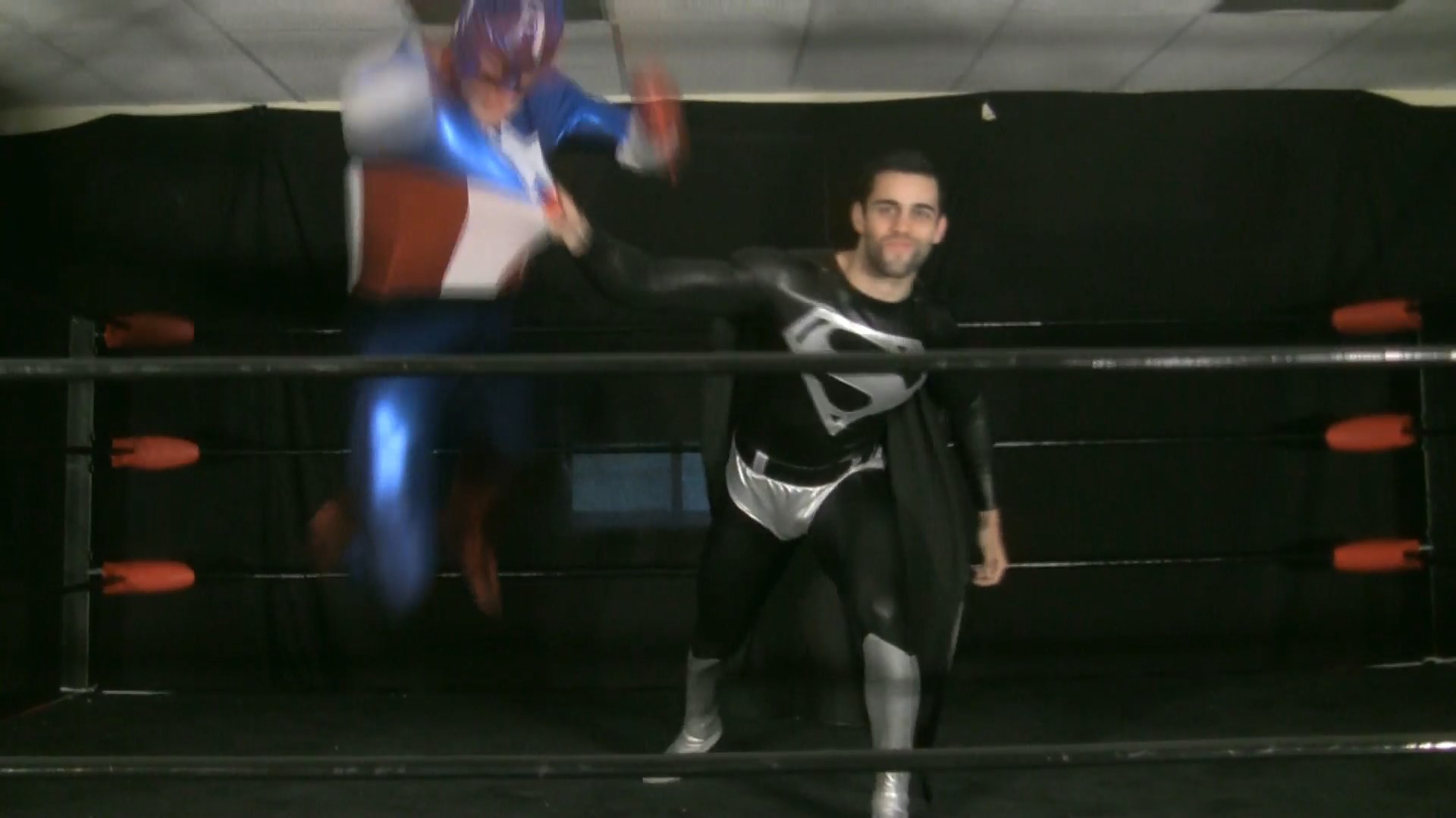The wrestling is nothing but an unmitigated squash from start to finish. Captain Twink never lays a hand on the Super Heel. Kev instantly makes it his mission to rip the Cap’n’s spandex supersuit from his hot body (thus instantly owning me as a Super Heel fan). The boys sell high impact crushing, stomping, and especially the throwing with considerably more skill than they deliver their lines. Not hating here, just observing that no one, with the possible exception of Damien, is going to be nominated for an Oscar for their performances thus far in Super Men. But this will not be news to the MDW boys, so I’m not too worried about hurting their feelings.