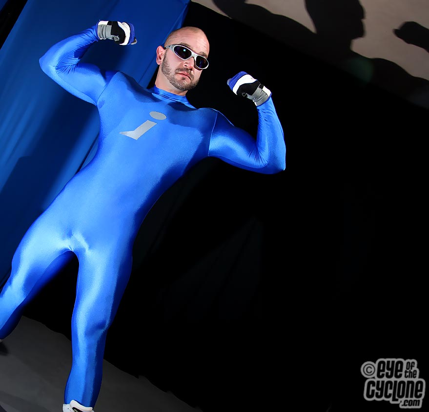 Neil at EOTC has given me permission to post some pics and gush a little, so cheers to Neil. There are now no fewer than 80 super character profiles that offer dozens of gorgeous photos each, along with each character’s alter egos, super powers, weapons, and backstory. For example, the Interceptors are five clones of the same scorching hot Italian helicopter pilot, who became a devastating fighting machine with the help of better living through super-genetic chemistry. Encased in blue lycra with a bold “i” across his bulging chest, each interceptor is one hot, hot hunk of a muscled stud out to fight the good fight for justice.