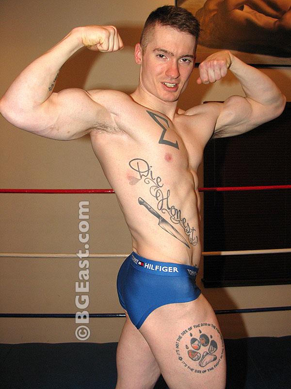 Pretty early on in our writing collaboration, we crafted an original character named Will Strong that we keep coming back to, again and again. Will is a hot, young muscle jock who, while on vacation in South Florida, finds himself recruited to audition for BG East. He’s naturally athletic, with a hot bod (of course) and a naive, earnest ambition to live out a pro wrestling dream he’s secretly nurtured since watching mainstream pro on TV as a kid (how many of us can identify with that?!). The first thing AR and I wrote about Will was a tag team match he wrestled with a certain homoerotic wrestling blogger, living out his homoerotic wrestling dream he’s secretly nurtured since watching BG East wrestling as a young adult (see the parallels?… we’re subtle). But we keep circling back to track Will Strong’s journey as a BG East rookie, in part because he’s hot and sexy and sensationally provocative heel bait. But he also has become a device to explore the behind-the-scenes as well as on-camera drama we enjoy imagining fueling the feuds and fires that both AR and I have long found so entertaining in BG East’s catalog. The more we write Will, the more 3D he and our BG East fantasyverse become, and it’s turning me on and tuning me into so much of what this entire blog is about.