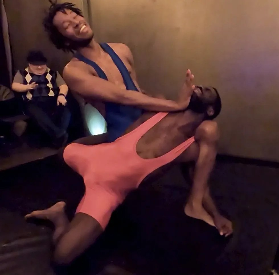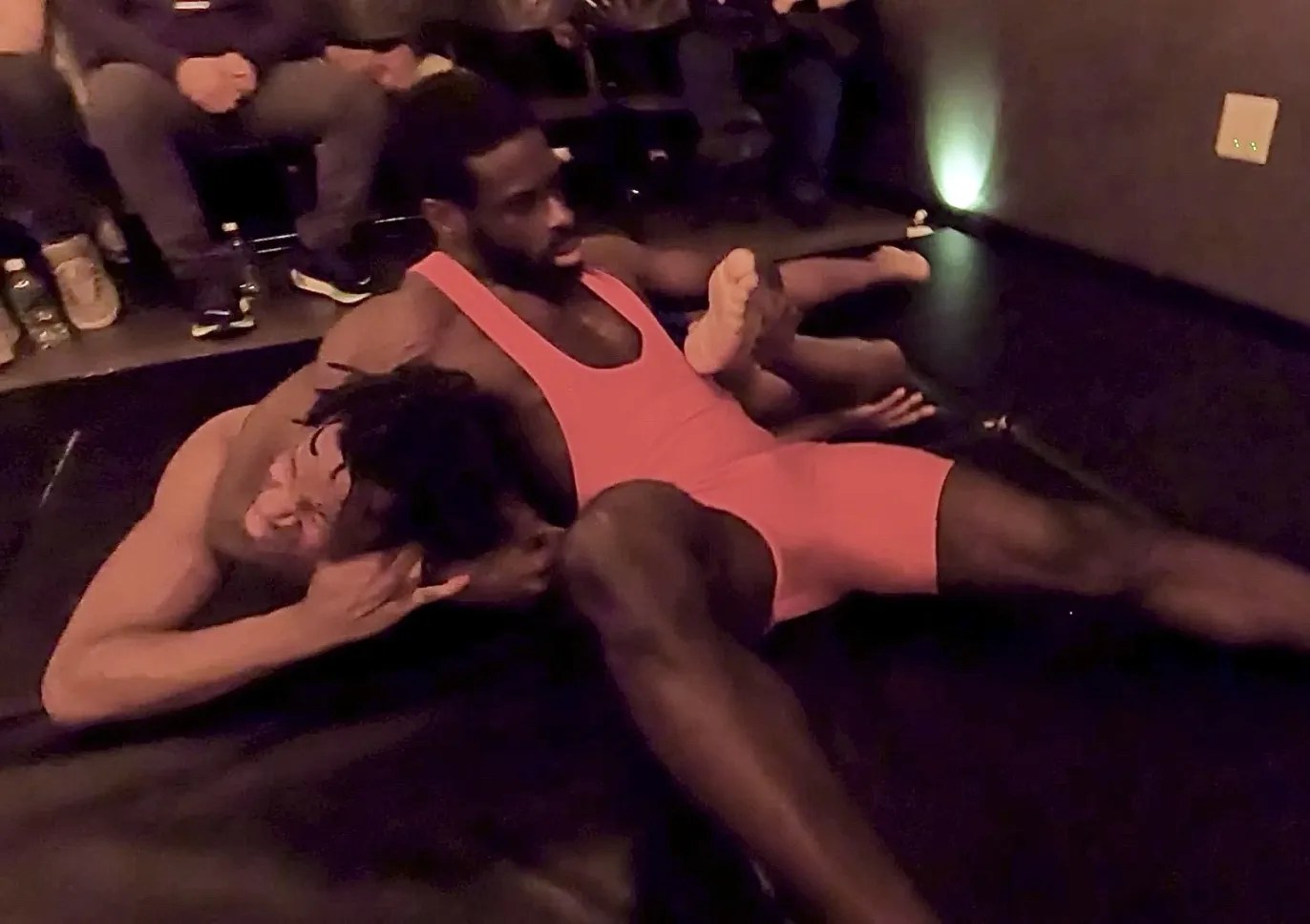 But then Seon casts his own spell on the audience in this spontaneous and audacious way that tugs at the crotch of even a Bobby-loyalist like me. The savvy veteran suffers hard and sells with authenticity that pulls at me deep in my gut as I watch. But he never panics, and he’s poised to counter at any second that Bobby loses focus (typically because Bobby distracts himself sucking face and possessing Seon’s trapped body… totally understandable). One such reversal of fortune relatively early on in the match features Seon, mid-liplock, popping out of Bobby’s rib crushing bodyscissors and using his long, strong limbs to yank the muscle hunk up into a kneeling abdominal stretch. It’s decisive and aggressive and graceful all at the same time. You can hear the unmistakable voice of Bob Wood who was sitting right in front of the action at this point, as Bob mutters his approval, “Right, stretch him out!” Another audience member from across the room calls out Seon’s so-pretty-in-pink-polished fingernails in this blunt way could have landed as a “man-up” provocation to Seon. But no, the pretty boy veteran lights up and wags his painted nails at us, and then sucks hard on each finger of his right hand, before jamming the heel of his palm under Bobby’s chin and stretching the trapped muscle hunk out that much farther. Every one of us in the room roars with delight, as Seon makes it clear he came to play and isn’t about to play jobber to this hard-bodied rookie.