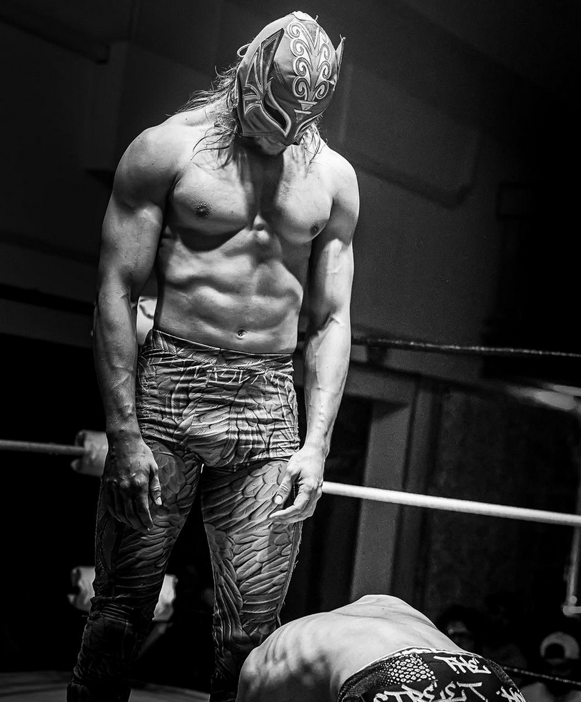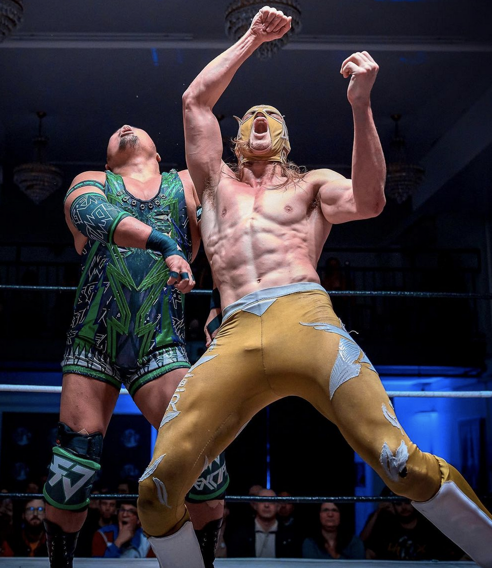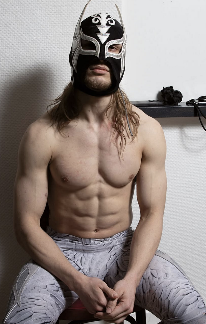 One of my current favorites is the French masked wrestler Aigle Blanc, who’s wrestled for a few different European productions. Physically, he’s just fucking stunning. I throw around the “physique like an anatomy chart” metaphor too often, I realize, but seriously, Aigle’s super ripped physique is like an anatomy chart. He’s ultra lean, in a way that honestly I’m not always into, but he wears it in such a mouthwatering way. He’s been tracked at 5’11 and 154 pounds, which is probably an exaggeration of how fucking lean he is, but I bet not by much. I always feel like I’m seeing him in double vision. Like, I see this super lean (bordering on downright skinny) dude (particularly in contrast with the solid as fuck beefcakes he’s typically facing), but almost superimposed on that is this lovingly sculpted muscle god with magnificent proportions and legitimate muscle thickness that takes my breath away. He’s skinny and stacked? Skacked? I fucking LIVE for glimpses of his face, like when he’s in a particularly vicious match when his mask gets partially clawed off. From that and the oblique angles partially disguising his face in his selfies on IG, I have this mental image of a handsome, angular face framed by his long, dirty blond locks. It’s probably totally a fiction, but I’m convinced I’d be as enamored with his good looks if I spotted him fully clothed in the wild as I’m infatuated with his hot body on display in the ring.