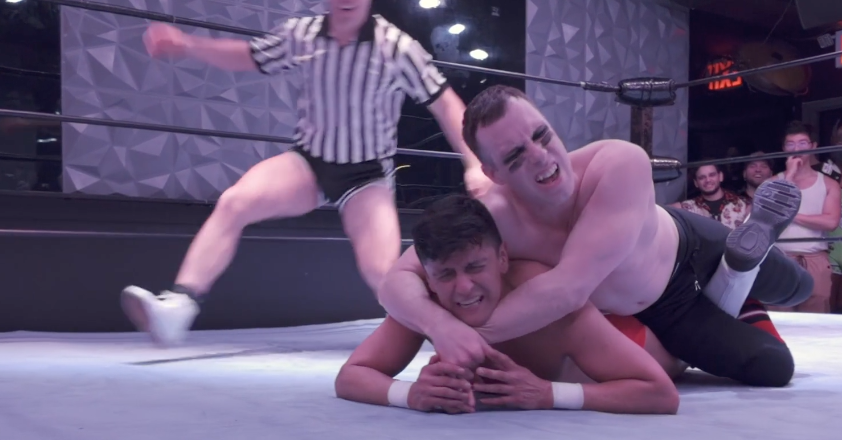 Rick and Dash tell a more calculated story when they’re in the ring. When the two of them are going at each other, there’s a furious back and forth of hot wrestling holds and near pins. Dash locks on a super sweet stepover toehold facelock that threatens to rip Rick’s head off his neck. In turn, Rick’s lariat on Dash nearly decapitates captain pecs, and the crowd keeps boiling over into an impassioned chant of “Roma! Roma! Roma!” Dash takes such a flurry of offense that at one point he slides out of the ring and looks like he’s about to walk off the scene entirely. Sir Dark taunts him from the corner and demands that Dash get his fine ass back in the ring so they can settle this. Dash delivers a super sexy, lip curling sneer as he climbs back onto the ring apron, jabbing a threatening finger toward Sir Dark and explaining, “Only because I’ll get a piece of you later!”