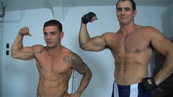 If there’s one thing I have to quibble about in this match, it’s the “custom” scenario built around Ace’s need to beat up on Angel because Ace caught Angel staring at him at the gym. This seems just shy of a gay panic concept, and I’m repeatedly on the record as opposed to that tired, homophobic old saw getting mixed up in genuinely hot homoerotic (even the PG version) wrestling. Still, the big v small scenario has a long tradition with more than a passing overlap with wrestling kink tastes (including my own). What Ace and Angel bring is a fascinating angle. The match is taped really, really up close. So, for example, when you see Ace’s thighs wrapped around Angel’s torso, you just can’t miss the amazing fact that Angel’s waist is, at most, barely bigger around than just one of Ace’s upper legs. When Ace has Angel in one of several face-to-crotch figure-four headlocks, Ace just looks impossibly big. When, in the same position, Ace gives a couple completely, absolutely unnecessary and entirely gratuitous hair yanks, the domination and humiliation are profoundly arousing. It’s not as if Ace needs to drive home the point any further that Angel is 100% under his paralyzing control. Ace does it just for kicks, and he gives the camera some long, lingering grins to let you and me know that he does it for our kicks, too.