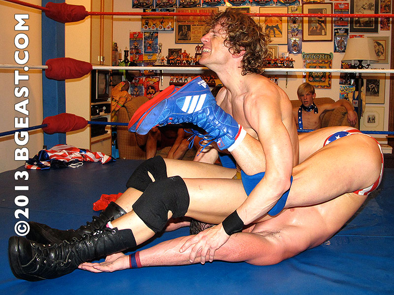 If there’s one thing that can raise my temperature hotter than watching Lon’s muscles dominated, it’s watching him muscle his way back into contention and start to apply the pedal to the metal in overcoming a young stud opponent. Just watching Lon’s chiseled abs pump and flex as he bears down on this babyface beauty in an abdominal stretch is mesmerizing! And don’t think for a minute Lon isn’t a crowd pleaser (despite the complaints of everyone at ringside other than Blaine), because he yanks on those adorably heroic American flag trunks of Cameron’s to show us Cam’s real moneymaker, that mindblowing ass!
