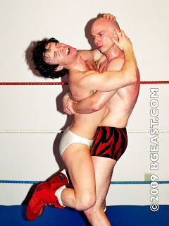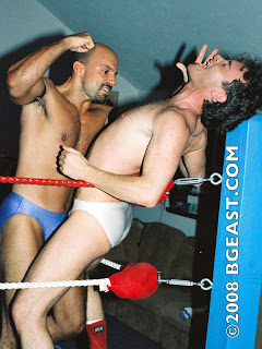 Ken: My partner has known all about my ties with BG East since the beginning of our relationship. He’s watched all five of my matches and is totally great with the fact that wrestling turns me on. He’s not into erotic wrestling himself, and I fully respect that; just as he respects my interest in it. We’re not together solely based upon our similarities. Our interesting differences help to bind us as well. Nobody wants to partner off with an ass-kissing, yes-man. I really believe that deep down, we all want and need an honest counterpart, someone who’ll awaken our conscience and bring us to our senses by figuratively slapping the stupidity out of us whenever we’ve stubbornly dug our heels into the ground, just to avoid bruising our ego! I’ve been “slapped” many times…and I’m a better man for it!