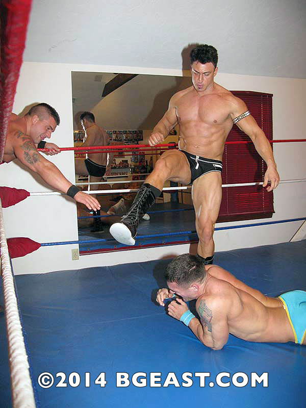 The crushing of Mr. Joshua is complete. B&B are delighted with themselves as they soak in the sight of the notorious badboy turned into their bitch. Brad, in particular, is intoxicated, bouncing for joy and luxuriating in flexing over the once mighty king of the ring. The Best Bulge winner two years running is an impotent puddle on the mat, not just outmuscled, but outmuscled by a pair of pretty boy jobbers-no-more. I’m smelling fresh meat, and if I know the ranks of ambitious young BG East wrestlers (and I do), I’m certain I’m not the only one. Mr. J’s hot ass and massive, pendulous, legendary package have got a pair of bullseyes painted on them.