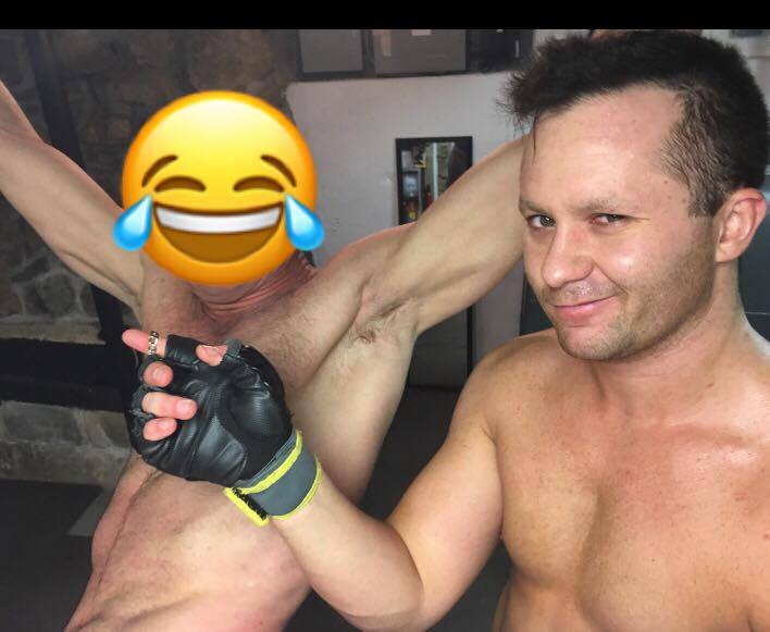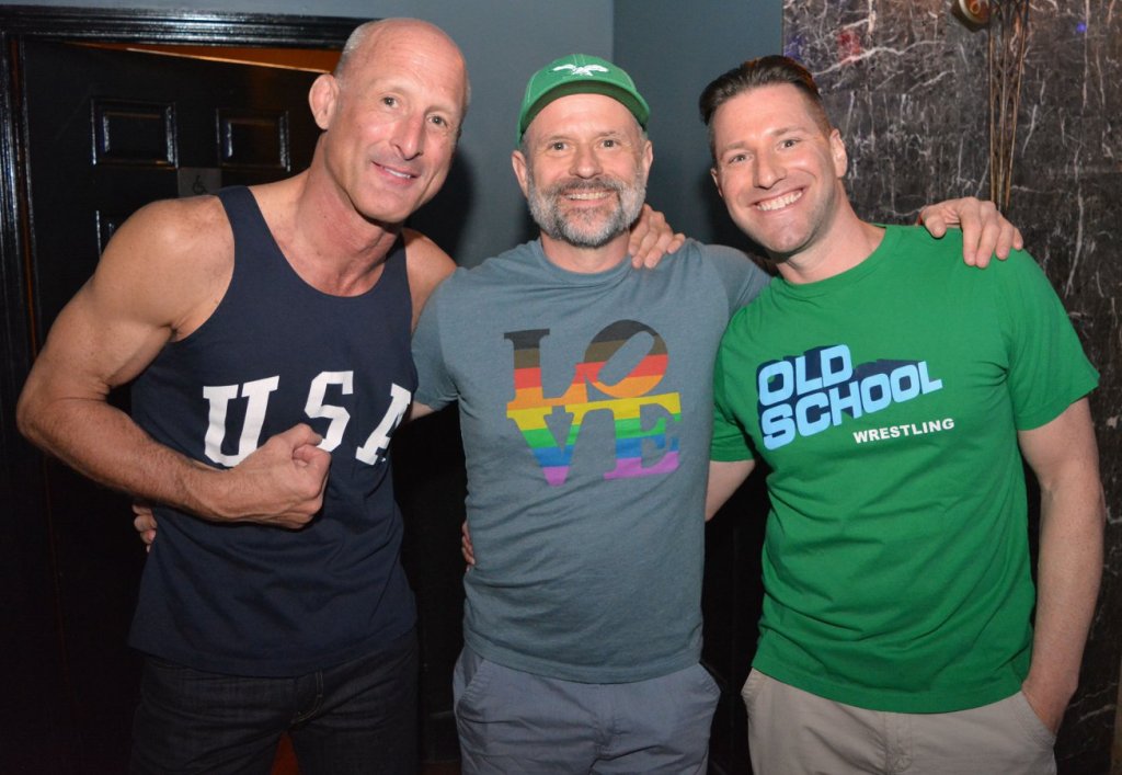 Good thing for Jonny, he brought back up. Mike’s no dummy, either, giving Brad a cold once-over when Jonny’s classic babyface BFF takes a seat on the couch to watch, wearing wrestling boots, trunks, a black leather jacket, and sunglasses. “Him? Oh, he’s just the time keeper, the bell ringer,” Jonny assures. “He’s never done this before. don’t worry about him.” Monstah Mike does not look worried in the least, even though you and I know that Brad has most definitely done “this” (ALL of this) before. Brad provides a little light comic relief with his spontaneous commentary as he watches Jonny run headlong, again and again, into that gorgeous brick wall. “Oh, my goodness,” Brad mutters like somebody’s grandma when Mike whips Jonny from corner to corner and then spears the Top Heel in the gut and send Jonny through the ropes and bouncing off the ring apron.