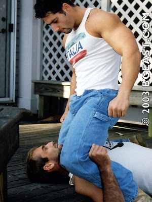 A couple of Watchfighters matches I’ve reviewed on the blog stand out for me. The first I want to mention is the growing Uruguayan production house headed by Muscles77 (who wrestled for BG East a while back as Marcelo Muscle). The crew behind matches like Muscles77’s match against Rocky Big Guns opens with a slow motion survey of both hardbodied wrestling hunks in turn, posing, flexing, sneering with cocky confidence at the camera as this unhurried, electronic melody with (mabybe?) a South American sensibility provides the soundtrack to our eye fucking, giving us time to decide whose mouthering muscles we want to see on top.