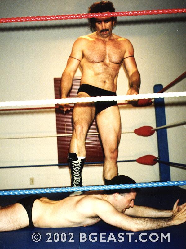 “So, picture a young gay boy who is super into wrestling and gets obsessed with the tombstone piledriver. I click on Google late one night and type “gay wrestling” into my mom’s laptop (sorry mom) and stumble upon BG East. I go into the search bar, and I type in “tombstone piledriver,” and this match pops up. I then rent the video, and slowly watch the eroticism unfold. Now, me being so young, I didn’t appreciate all the nuances about this match that I do now. But back to the tombstone…. So, when BBW had just knocked out young Brendan with a bearhug, he then looks at the camera and says, “What’s the expression” Then dragging a thumb across his throat, signals the end for Brendan, but then makes the same signal across his crotch. I knew we we’re in for a wild ride! BBW then picks up Brendan and asks him, “Let’s see if you you learned anything. I am Brooklyn Bodywrecker. Who’s your daddy?” Brendan replies with, “You are sir!” Then BBW looks at the camera and says, “Music to my ears.” BBW then hoists Brendan up and gets him into position. He always makes these noises when he lifts up opponents, and it’s so hot. It just reeks of domination, really. If you listen closely, you can hear Brendan moan, which only makes my dick moan, too. Then BBW pulls him up just a bit closer for safety, and to make sure Brendan is getting a full taste of his Daddy’s crotch. He walks Brendan around the ring until they are facing the mirror, which is such a Heel move, really. I love that BBW is always posing and making us appreciate his body! And, in a sense, he does that as well with Brendan, because he knows how much he and Brendan are hot together here. I also love the contrast of their trunks, because it shows off BBW’s best assets, and Brendan looks good in his sexy trunks. Then BBW goes up for the windup, which is very methodical, making sure Brendan gets plenty of time trapped there, before BBW drives the top of his head down and then sits bad to marvels at his work. [Harvey, aka, my Tombstone-obsessed friend]