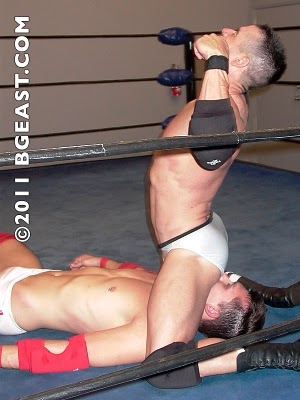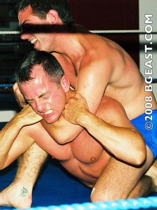 As a fellow follically-challenged individual, I have to say it’s value-added watching Scott yank Bryan around by his thick blond locks. Like, sure… let’s see an opponent try a tit-for-tat hair pull on Scott. Showing a flair for heeling that’s honestly inspired, I’m also getting OFF on him violently ripping the silk ring jacket off of Bryan and using it to choke the seriously rocked veteran pro. And then he yanks Bryan up to his feet and legitimately snap mares the gasping, flailing beefcake over his shoulder by the jacket wrapped around his throat. Woah. WOAH! He repeatedly rakes the pro across the eyes and claws him in the balls. Private wrestlers, even “nasty” ones, just aren’t supposed to have this much aggression, skill, and relentlessness in their first time stepping into the ring. I mean, sure, sure. They’re supposed to look like that… ripped muscled hunks, cocky, stunning to look at, maybe even putting up a good fight. But Scott is having his WAY with Bryan through the majority of this bout, and it’s gorgeous and surprising in all the right ways.