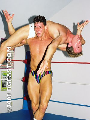 Newcomer Scott, on the other hand, isn’t so respectful. Bob Wood, the ring announcer, calls the 6’2, 195 pound “nasty private fighter” “Stunning Scott Williams.” So, again, yeah… not a lot has changed since then. He looks fucking stunning, to say the least, in his sensationally tight grey square cut trunks and black boots. The announcer’s introduction suggests Scott is just a few inches taller than Bryan, but he seems to tower over the muscle-packed pro pretty boy. Maybe he just looks taller, when he’s attacking Bryan from behind before the award-winner can take off his ring jacket. His debut match, and Scott is playing it mean and dirty. Yep, yep. Again, not a lot has changed.