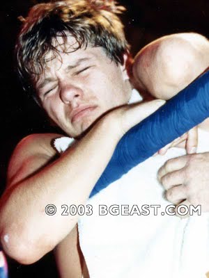 Bryan was a absolute fixture in those days. Kid Leopard is literally awarding Bryan the first ever “BG East Lifetime Achievement Award” just before his match with Scott. Bryan is so fucking adorable, accepting the honor with a blush and stuttering, ah-shucks gratitude. “‘I’m thankful to be a part of the brotherhood of BG East wrestling,” he says. “It’s really been an important thing in my life.” I know I’m the biggest mark, but damn it, I swear he and Kid Leopard are having a little moment there. A little less gimmick than you might expect. A good deal more sincere respect.