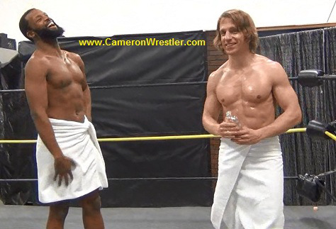 The towels comes off to reveal beautiful speedos suctioned to the phenomenal asses of these two seasoned wrestlers. Quickly, playground shoving turns into full contact combat to subdue and take possession of the coveted bottle of lubricant. But despite long resumes of pro wrestling experience, there’s nothing quite like trying to apply a hold to a powerful body slathered in oil. They swarm all over each other, quickly slipping and crashing to the mat, sliding and slithering across each other’s struggling bodies to figure out how secure a hold and, even more difficult, maintain it.