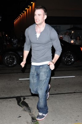 Pics from the set of Captain America, starring superhero everyman, Chris Evans, are popping up to make us ache. Chris’ body is so stunning that it makes me gasp just a little even when he’s fully clothed.